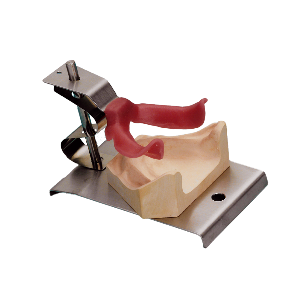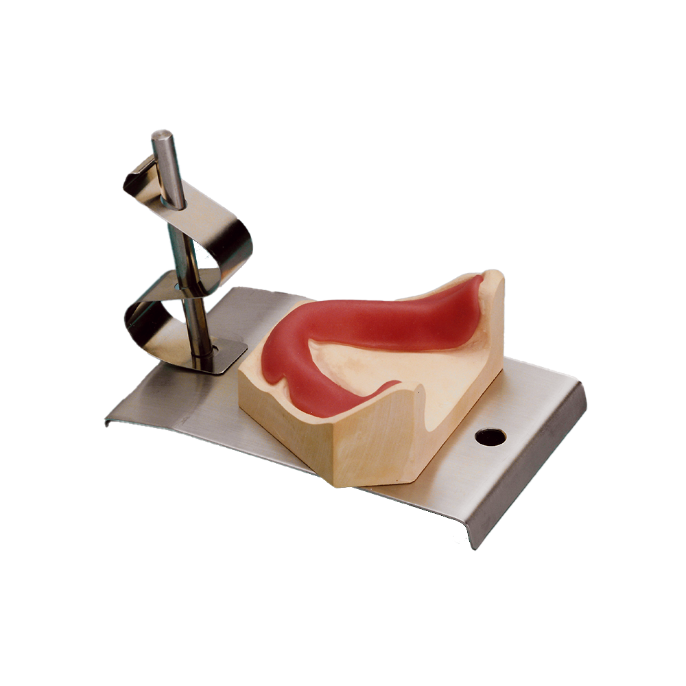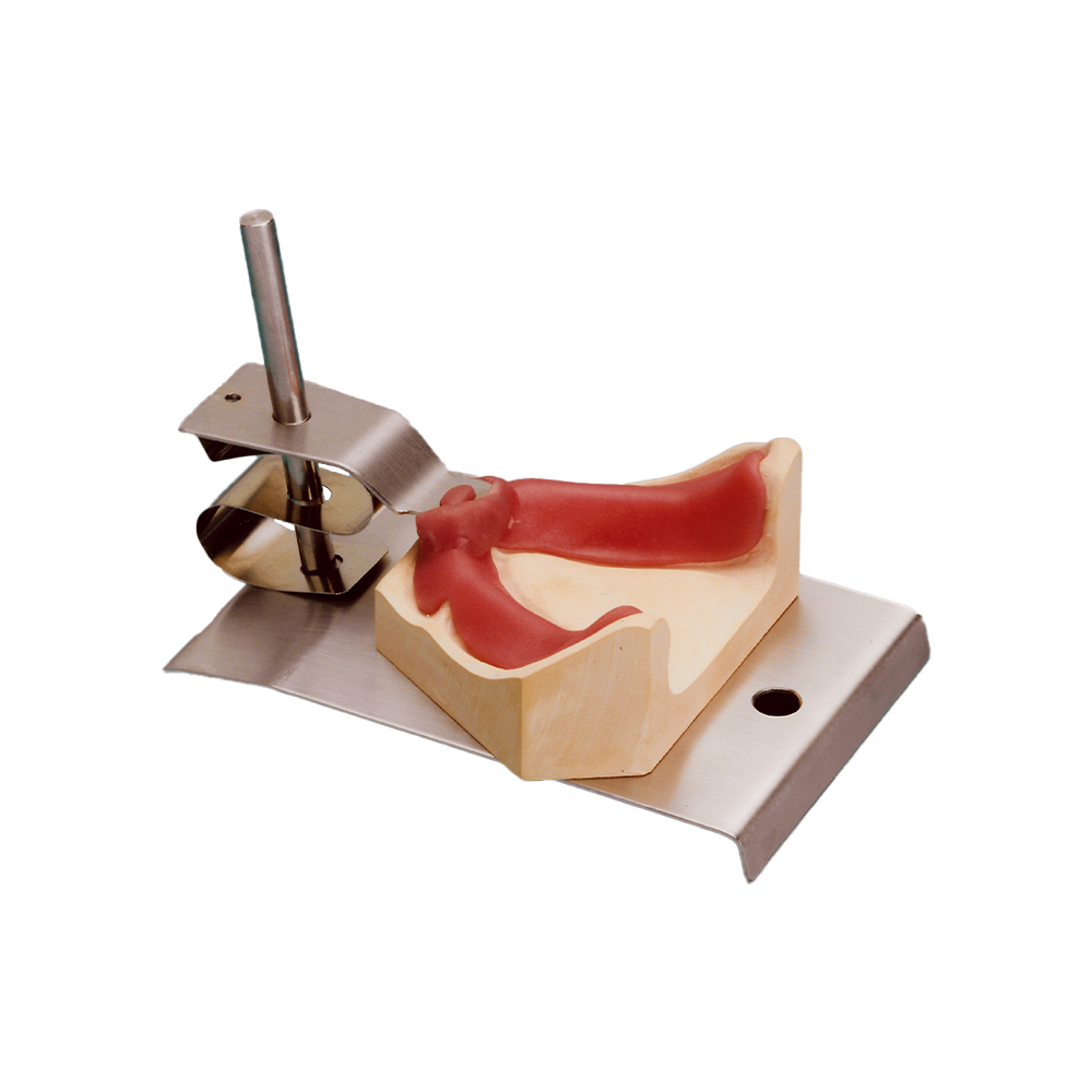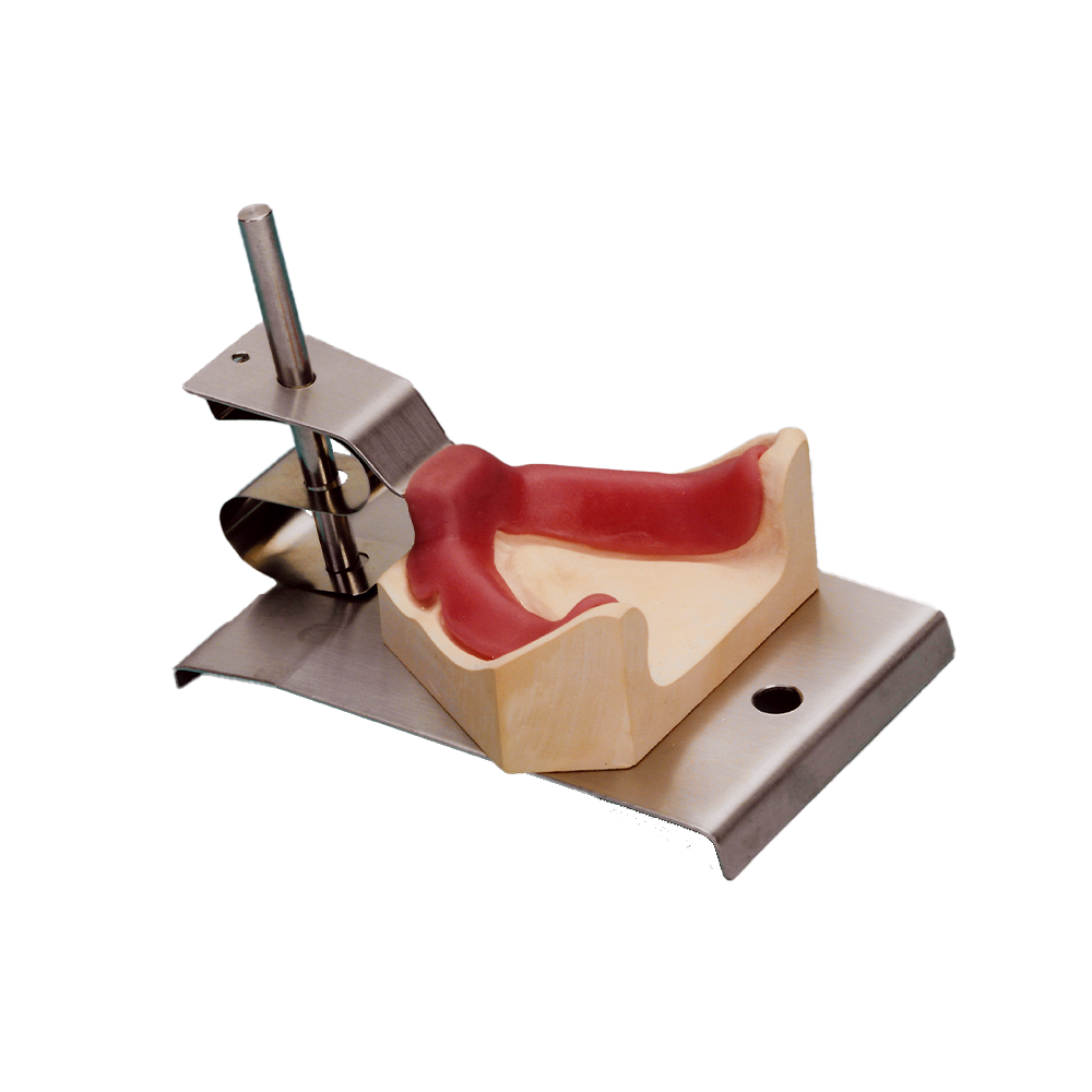 Löffelgrifffixator aus Edelstahl gefertigt, zum einfachen, horizontalen Fixieren von Löffelgriffen mit Hilfe einer Klemmfeder. Die Löffelgriffe sind aus Edelstahl gefertigt, jederzeit wiederverwendbar und problemlos zu desinfizieren. Es gibt gekröpfte Griffe für totale Prothesen und Gerade für bezahnte Kiefer.